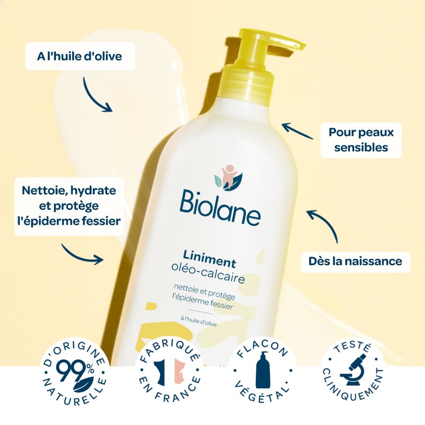- Le liniment oléo-calcaire Biolane nettoie et protège en un seul geste le siège de votre bébé, en laissant un film protecteur contre les agressions extérieures irritantes (urines, selles, frottement des couches…).