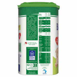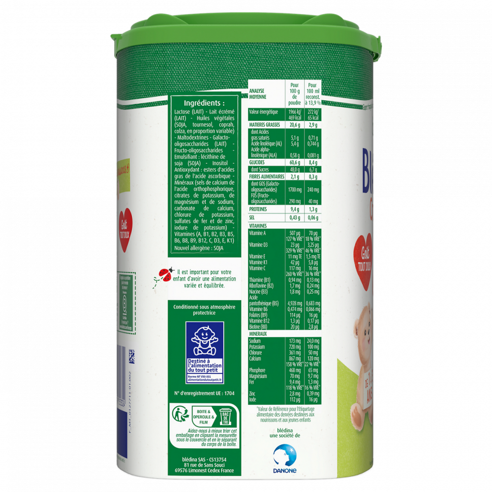 Ingrédients : Lactose (LAIT) – Lait écrémé (LAIT) – Huiles végétales (SOJA, tournesol, coprah, colza, en proportion variable) – Maltodextrines – Galacto-oligosaccharides (LAIT) – Fructo-oligosaccharides – Emulsifiant : lécithine de soja (SOJA) – Inositol – Antioxydant : esters d’acides gras de l’acide ascorbique – Minéraux (sels de calcium de l’acide orthophosphorique, citrates de potassium, de magnésium et de sodium, carbonate de calcium, chlorure de potassium, sulfates de fer et de zinc, iodure de potassium) – Vitamines (A, B1, B2, B3, B5, B6, B8, B9, B12, C, D3, E, K1).