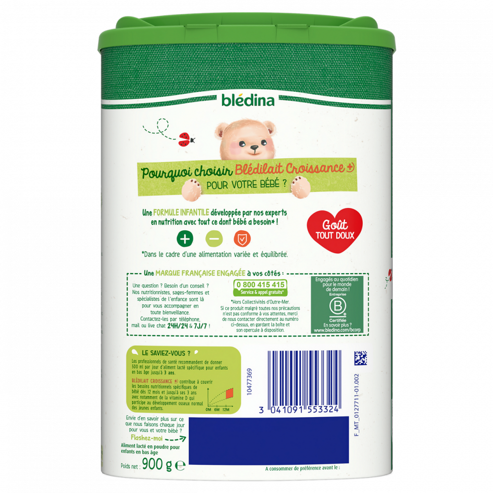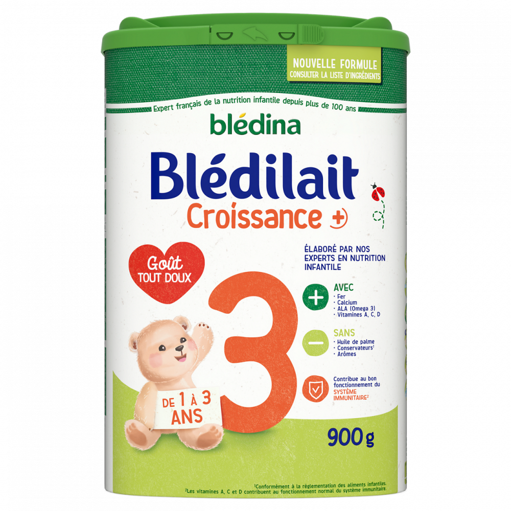 • 8 x plus Acide Gras Essentiel qui contribue au développement normal du cerveau (Par rapport au lait de vache demi-écrémé UHT, Anses, Ciqual, 2020. (Acide alpha-linolénique)Le saviez-vous ? Entre 1 et 3 ans, les pédiatres recommandent 500 ml/jour d’aliment lacté spécifique, dans le cadre d’une alimentation variée et équilibrée. Dès 1 an, découvrez BLEDILAIT CROISSANCE + qui contient 13 fois plus de vitamine D* qui contribue au fonctionnement normal du système immunitaire, à la croissance et au développement osseux normaux Le lait de vache n’est pas encore tout à fait adapté aux besoins nutritionnels spécifiques des jeunes enfants de 1 à 3 ans *Par rapport au lait de vache entier UHT, Anses, Ciqual, 2020
