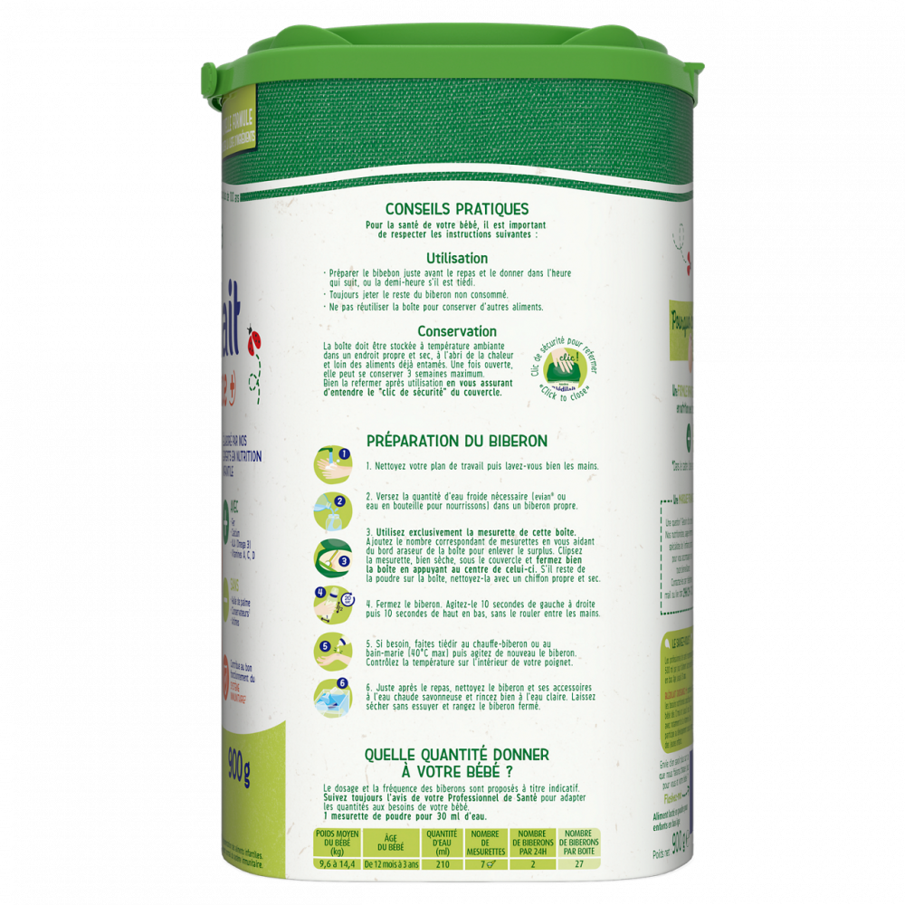 • Avis Important : Le lait maternel est l’aliment idéal et naturel du nourrisson. Toutefois, si vous ne pouvez pas ou ne souhaitez pas allaiter, le Corps Médical vous conseillera une préparation infantile répondant aux besoins nutritionnels spécifiques de votre enfant. Ce produit convient à l’alimentation de votre bébé, n’en changez pas sans demander l’avis de votre médecin. Le lait de suite est un élément de l’alimentation diversifiée des nourrissons à partir de 6 mois et ne peut pas être utilisé comme substitut du lait maternel pendant les 6 premiers mois de la vie. La décision d’introduire des aliments complémentaires doit être prise sur l’avis des professionnels de santé.