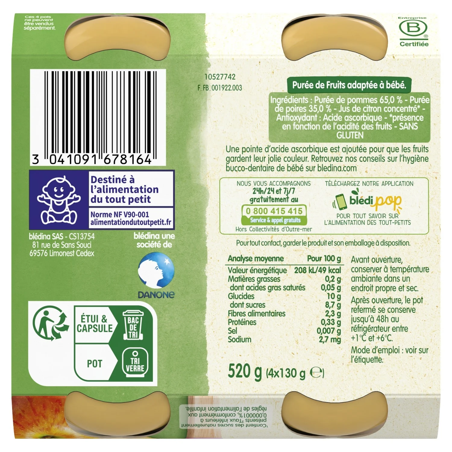 Ingrédients : Purée de pommes 65,0 % – Purée de poires 35,0 % – Jus de citron concentré* – Antioxydant : Acide ascorbique. * présence en fonction de l’acidité des fruits . SANS GLUTEN