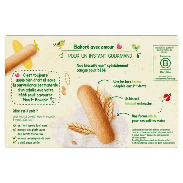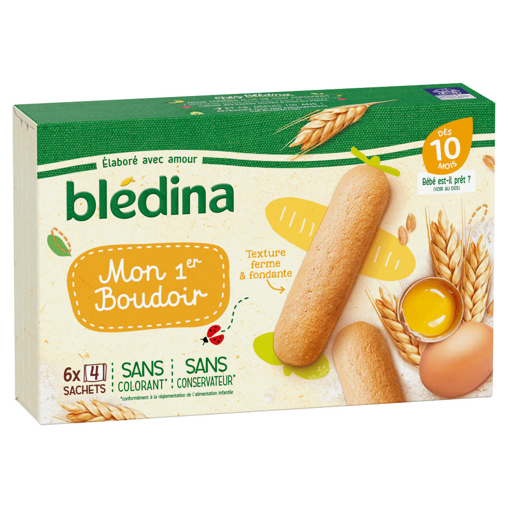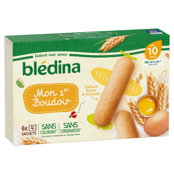 Découvrez Mon 1er Boudoir de Blédina : des biscuits spécialement conçus pour Bébé dès 10 mois (se référer ci-dessous aux détails des informations du produit pour savoir si bébé est prêt), pour un petit-déjeuner ou un goûter gourmand et adapté. Sa texture, croquante puis fondante en bouche, accompagnera bébé dans la découverte de nouvelles textures.