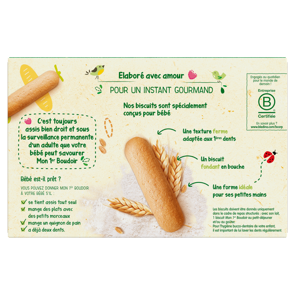 • Important : Vous pouvez donner ce biscuit à votre bébé s’il : se tient assis tout seul dans sa chaise bébé et mange des plats avec des petits morceaux et mange un morceau de pain et a déjà deux dents. Attention : C’est toujours assis bien droit et sous lasurveillance permanente d’un adulte que votre bébé peut savourer ce biscuit.C’est toujours assis bien droit et sous la surveillance permanente d’un adulte que votre bébé peut savourer Mon 1er Boudoir.