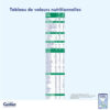 - Ingrédients : Huiles végétales (palme, coprah, colza, tournesol) – Lactose (LAIT) – Lait écrémé (LAIT) – Amidons – Galacto-oligosaccharides (LAIT) – Lactosérum déminéralisé (LAIT) – Concentré de lactosérum (LAIT) – Protéines de lactosérum (LAIT) – Fructo-oligosaccharides – Huile de poisson (POISSON) – Mortierella Alpina – Emulsifiant : lécithine de soja (SOJA) – Antioxydant : esters d’acides gras de l’acide ascorbique – Chlorure de choline – Taurine – Inositol – L-Carnitine – L-Tryptophane – Nucléotides – Minéraux (sels de calcium et de magnésium de l’acide orthophosphorique, chlorures de magnésium, de potassium, de calcium et de sodium, citrates de potassium et de sodium, sulfates de fer, de zinc, de cuivre et de manganèse, carbonate de calcium, iodure de potassium, sélénite de sodium) – Vitamines (A, B1, B2, B3, B5, B6, B8, B9, B12, C, D3, E, K1).