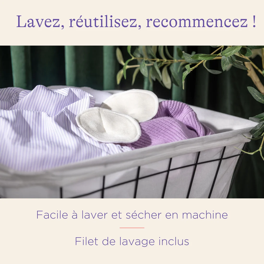 - Nettoyage : Après utilisation, rincez les coussinets à l’eau froide pour éliminer les résidus de lait. Placez-les ensuite dans le filet de lavage fourni pour les laver en machine à 40°C maximum. Utilisez une lessive douce et évitez les adoucissants pour préserver leur absorption. Laissez-les sécher à l’air libre pour prolonger leur durabilité.