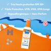 • TRIPLE PROTECTION: UVB + UVA + UVA LONGS Résiste à l’eau – Anti-sable. Spécifiquement formulé pour les peaux fragiles des enfants