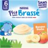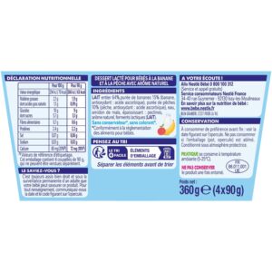 Ingrédients : LAIT entier 64%, purée de bananes 15% (banane, antioxydant : acide ascorbique), purée de pêches 10% (pêche, antioxydant : acide ascorbique), eau, amidon de maïs, épaississant : pectines, arôme naturel, ferments lactiques (LAIT).