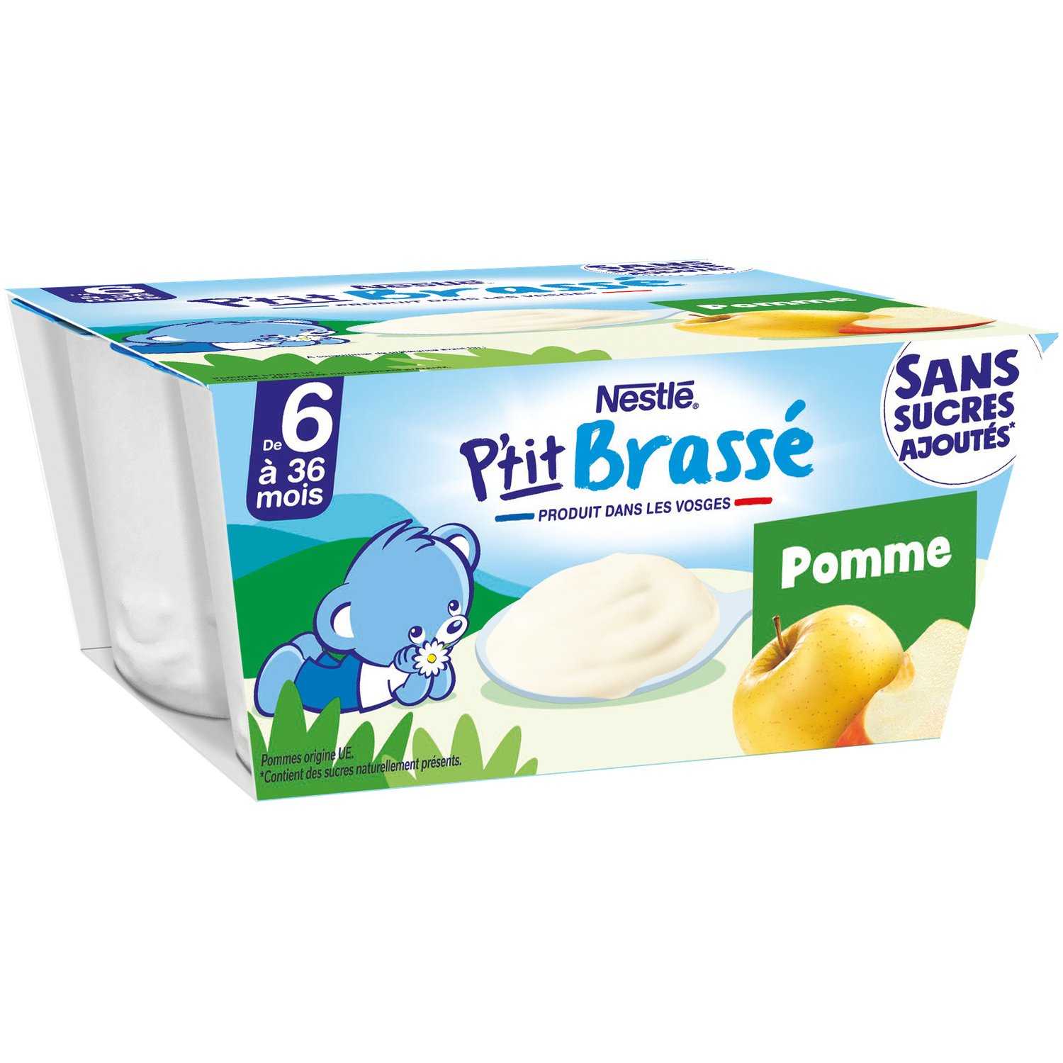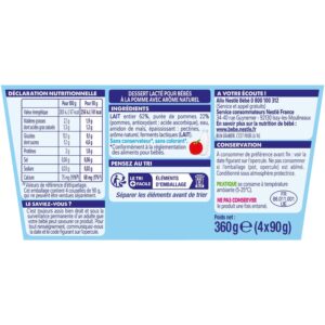 Ingrédients : LAIT entier 62%, purée de pommes 22% pommes, antioxydant : acide ascorbique), eau, amidon de maïs, épaississant : pectines, arôme naturel, ferments lactiques (LAIT).