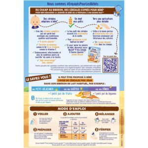 - Conçues exprès pour bébé**, avec des céréales complètes qui ont gardé leur enveloppe aux nombreuses qualités nutritionnelles, et enrichi en minéraux et en vitamines, pour agrémenter le lait habituel de bébé***, pour bien démarrer la journée de bébé ou le préparer à une bonne nuit***. Veillez à respecter l’appétit de votre bébé.