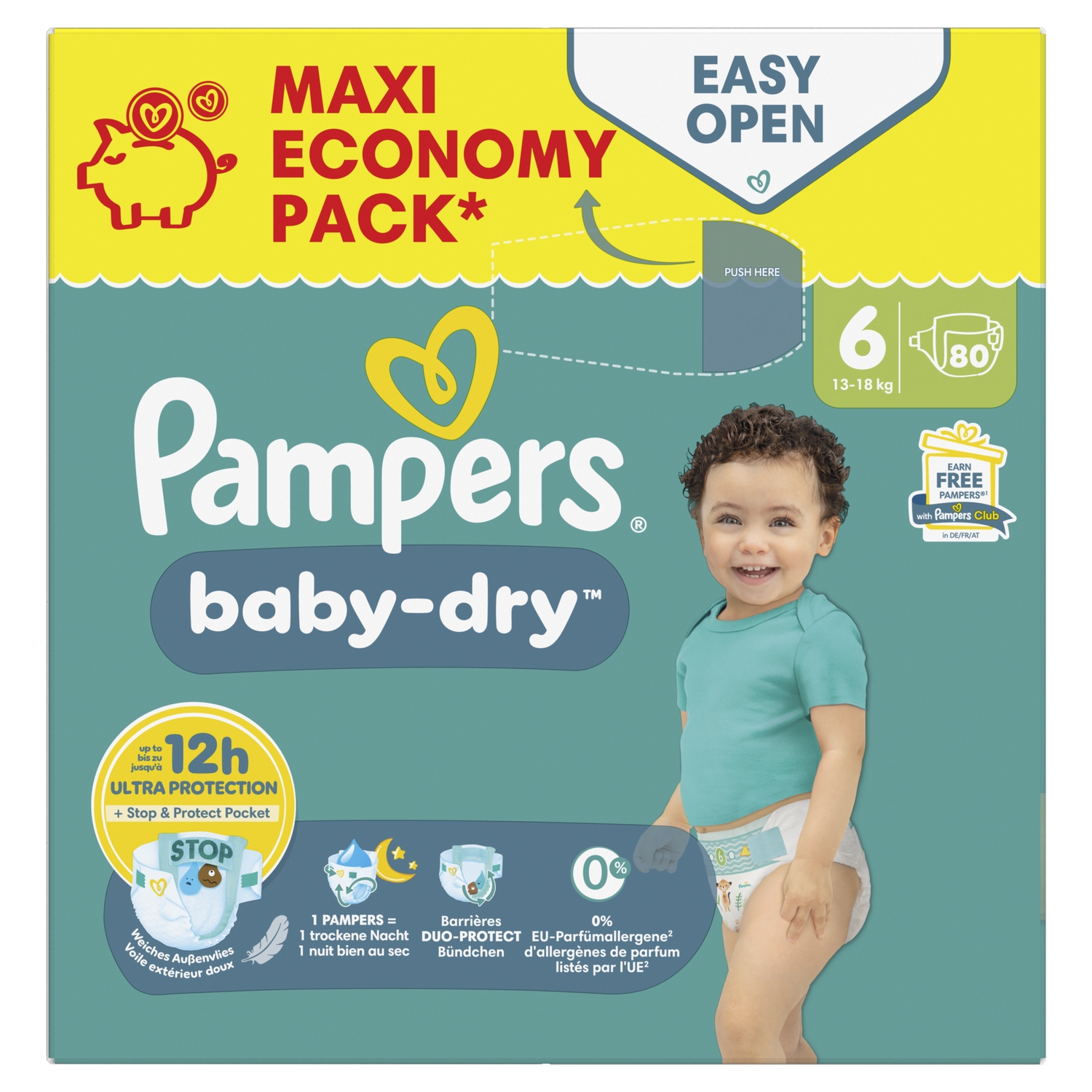 Pampers Couches Taille 6 (13-18 kg), Baby-Dry, 80 Couches Bébé, Jusqu’à 12h Bien Au Sec et Avec Double-Barrière Anti-Fuites.