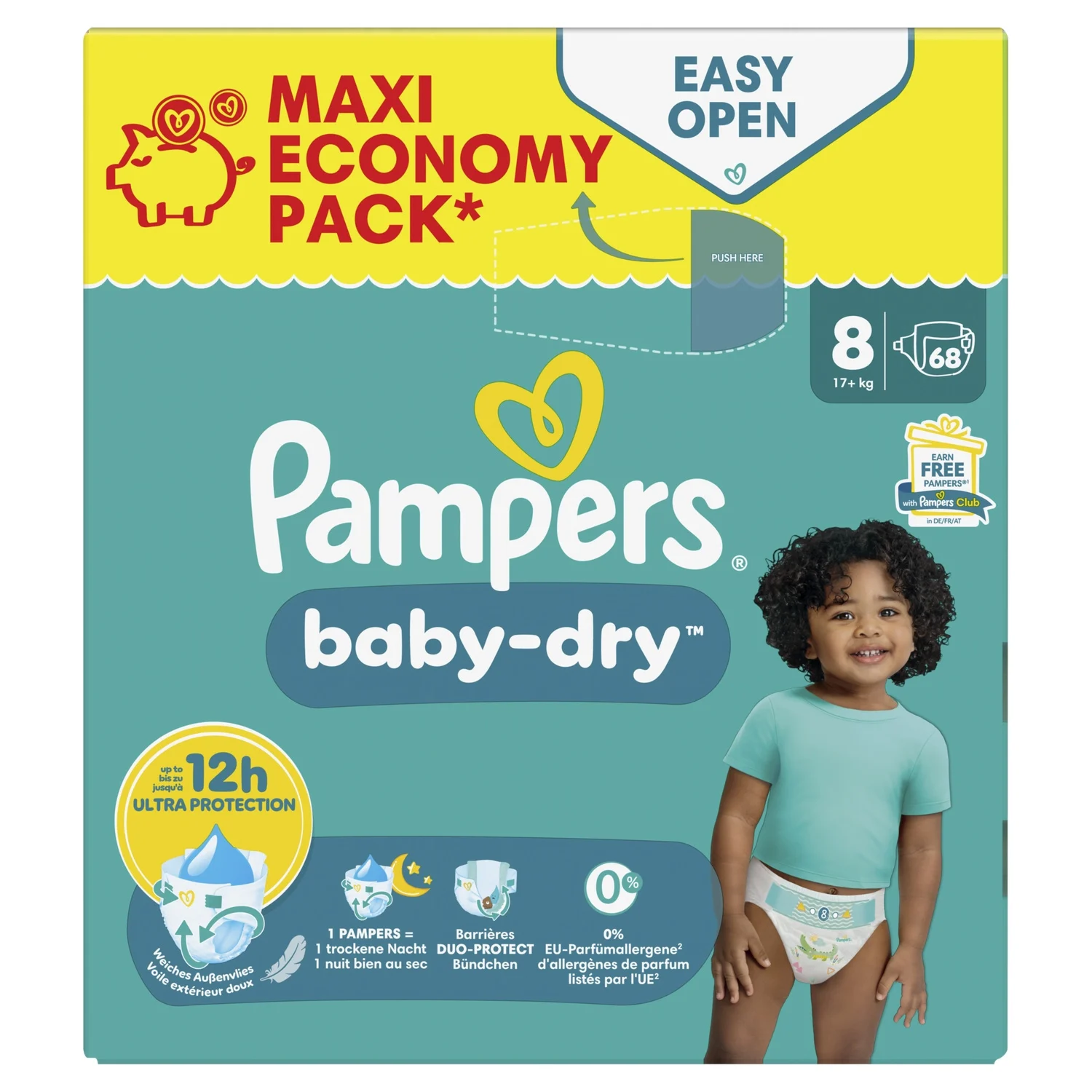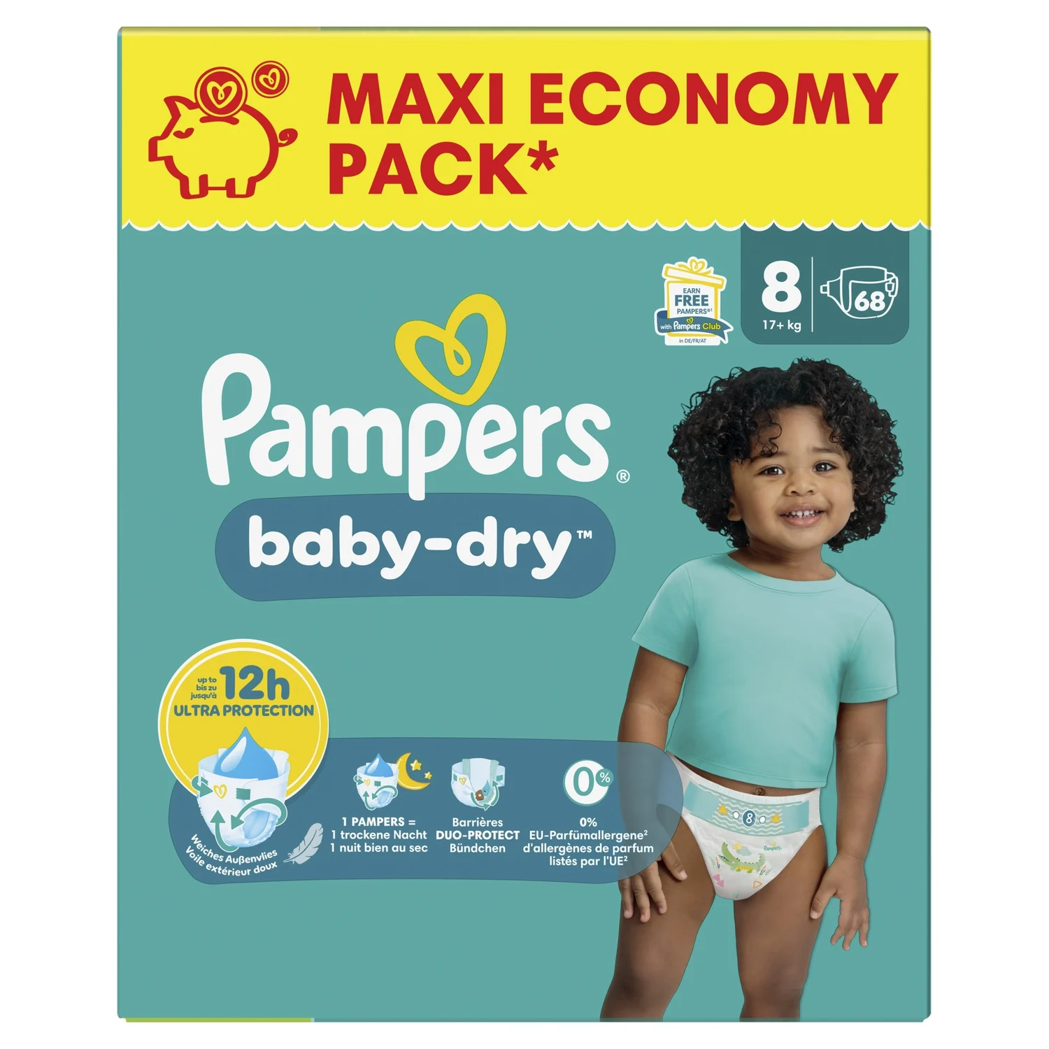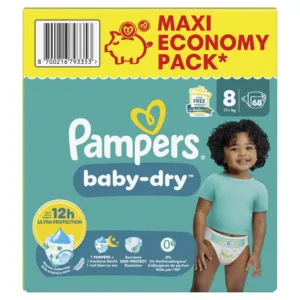 Pampers Couches Taille 8 (17 kg+), Baby-Dry, 68 Couches Bébé, Jusqu’à 12h Bien Au Sec et Avec Double-Barrière Anti-Fuites.