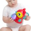 - Le projecteur émet des étoiles et divers motifs. La nuit, il se transforme en veilleuse portable. Dès que Bébé la place près de sa joue, l’appareil fait entendre de la musique (jusque 20 min.) et émet des lumières. Votre petit bout apprend ainsi les relations de cause à effet.